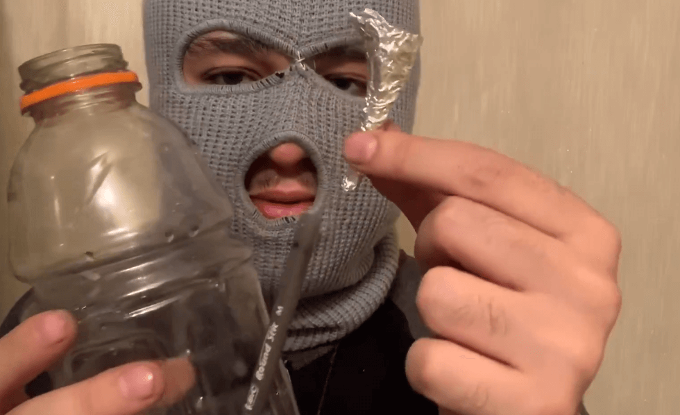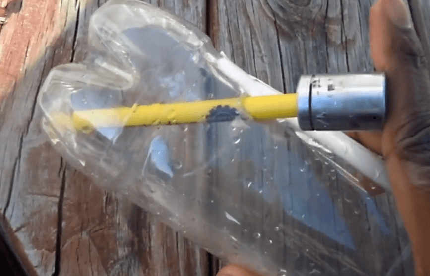 Đặt một chiếc đinh hoặc móc treo quần áo bằng dây thép đã được duỗi thẳng vào kìm, sau đó hơ nóng đầu của nó cho đến khi đỏ rực trên ngọn lửa của bật lửa hoặc bếp gas. Tiếp theo, cẩn thận đưa nó vào chai nhựa để đục một lỗ chính xác mà không làm nứt vật liệu nhạy cảm. Nhiệt độ cục bộ từ quá trình xử lý nhiệt này làm bay hơi nhựa theo cách tạo ra các cạnh mịn và bền, từ đó ngăn ngừa các vết nứt do ứng suất cứng có thể xảy ra khi đục lỗ bằng phương pháp lạnh.